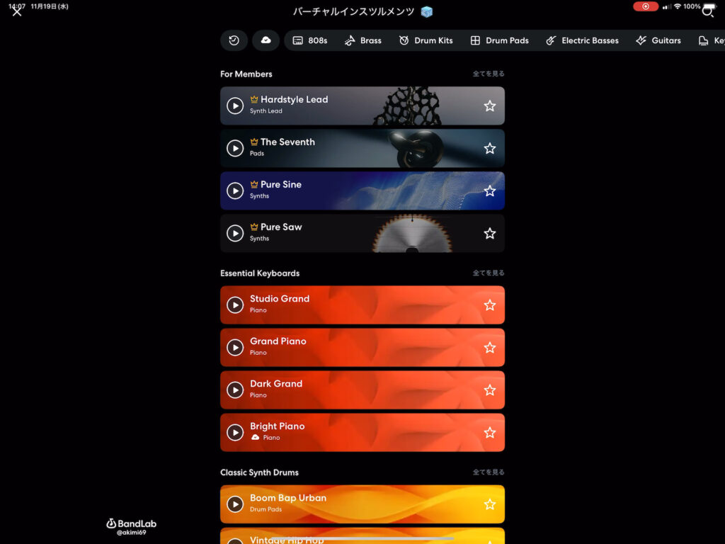 バーチャルインスツルメンツにピアノやギター、ドラムなどいろいろなサウンドがあるので、好きなサウンドで作って行きます。