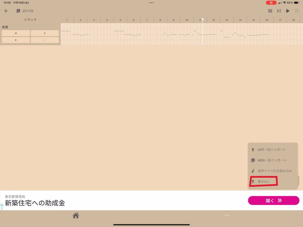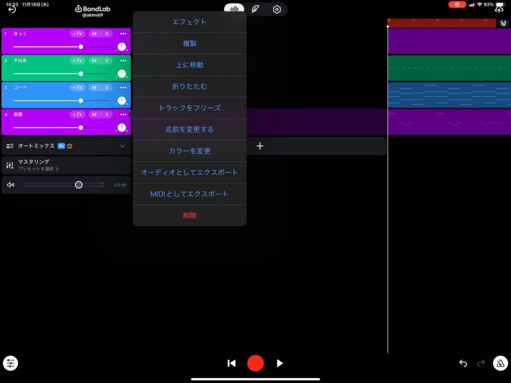各トラックのところの”・・・”をタップして、”MIDIとしてエクスポート”をタップします。これでトラックごとにMidi出力が可能です。