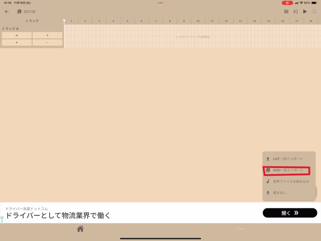 そのメニューの中の”MIDI一括インポート”をタップして、先ほど作ったメロディーのMIDIデータを読み込みましょう!