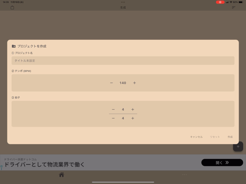 まず、ホーム画面の+ボタンから新規プロジェクトを作りましょう。この時、BPMや拍子をBandLabで作っている曲に合わせることを忘れないようにしましょう。