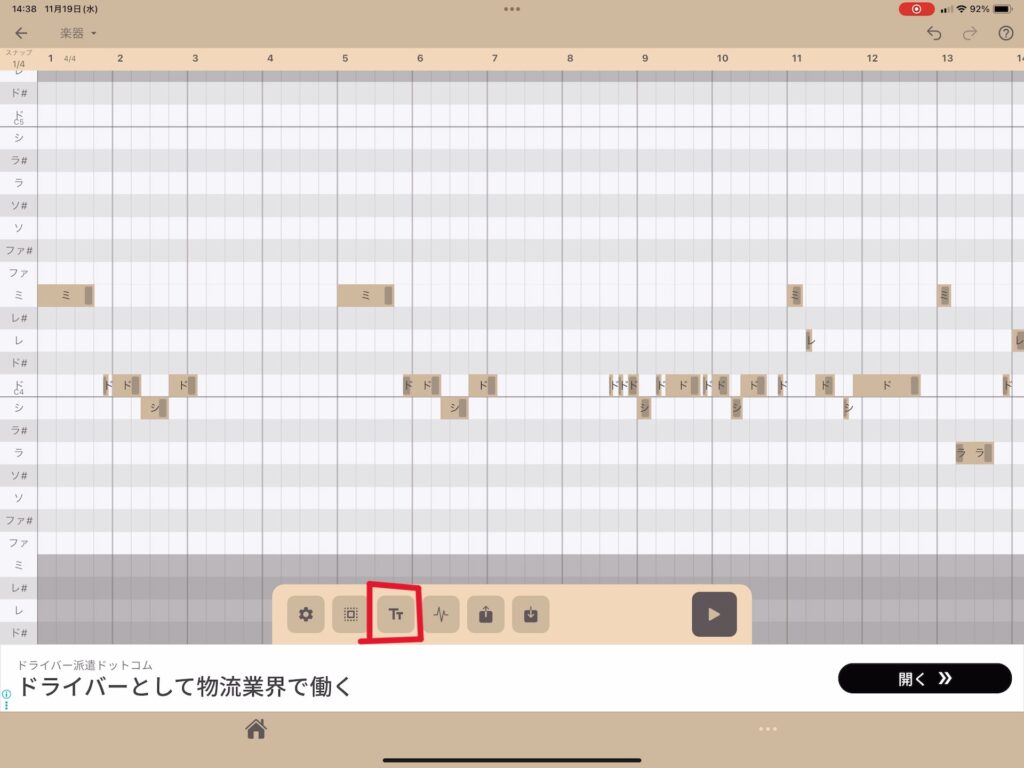 歌詞の打ち込みは”Tt”みたいなマークをタップします。↓